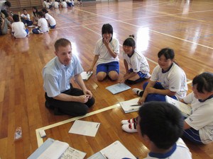 ダンスを踊ったり、ローマ字での自分の名前を手話で表したり、フットボールの投げ方を教えてもらって簡単なゲームをしたりなど、ALTの先生が説明してくださる英語を一生懸命聞き、理解し、どのグループも盛り上がっていました。