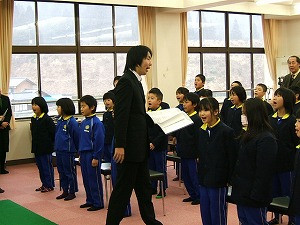 17日(月)にびわ湖ホールから3人の方が塩津小学校へ来て下さり、声楽アンサンブルを開いて下さいました。アンサンブルメンバー2人と、ピアニスト1人の方々です。初めに、子ども達が音楽の教科書で学習している文部省唱歌を交え、「茶摘み」や「もみじ」「とんび」等を歌って下さいました。斉唱でとても美しい声で歌って下さり、子ども達の中から「すごーい!!」という驚きの声が聞こえてきました。男の人の「バス」の声はとても低くずーんと重みのある声で、一方、女の人のソプラノの声は、透き通るような美しい声でした。今まであまり耳にすることのない歌声に本当に圧巻でした。子ども達は、たくさん聴かせていただいた中でも「アラジン」の歌がとても良かったようです。もう一度聴きたいほどです。