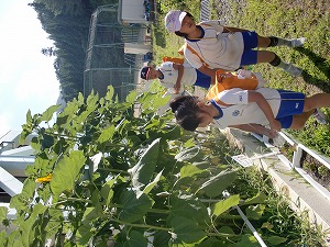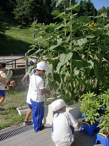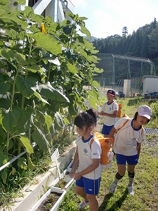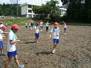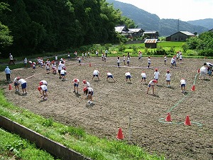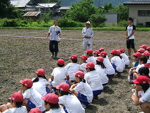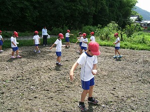 学校の校門前に、「田んぼの学校」にお借りした水田があります。しかし、昨年にイノシシが侵入したため今年は休耕田とする予定でしたが、推進委員会でそこを【コスモス畑】にして子ども達のいろいろな活動に利用すればという意見が出ました。地域の意見を踏まえ、地域の協力を得た教育活動を進めることがこの協議会の趣旨でもありますので、早速具体化して、7月12日に「コスモスの種」を全校でまきました。