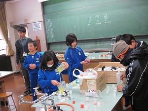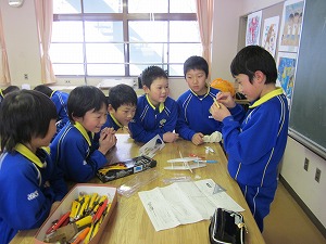 さいごは、科学研究クラブ。ブーメラン飛行機の実演を見たり空気砲を体験したりしました。大きな空気砲に、男の子たちは興味津々。実際にその威力を感じてました。帰りには、スライムのお土産をいただきました。