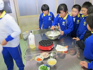 次は、調理・手芸クラブでは、たこ焼き作りに挑戦。たねをつくったり、型に流し込んだりする体験をしました。クラブ見学後には、試食もさせていただきました。おいしかったね。