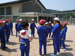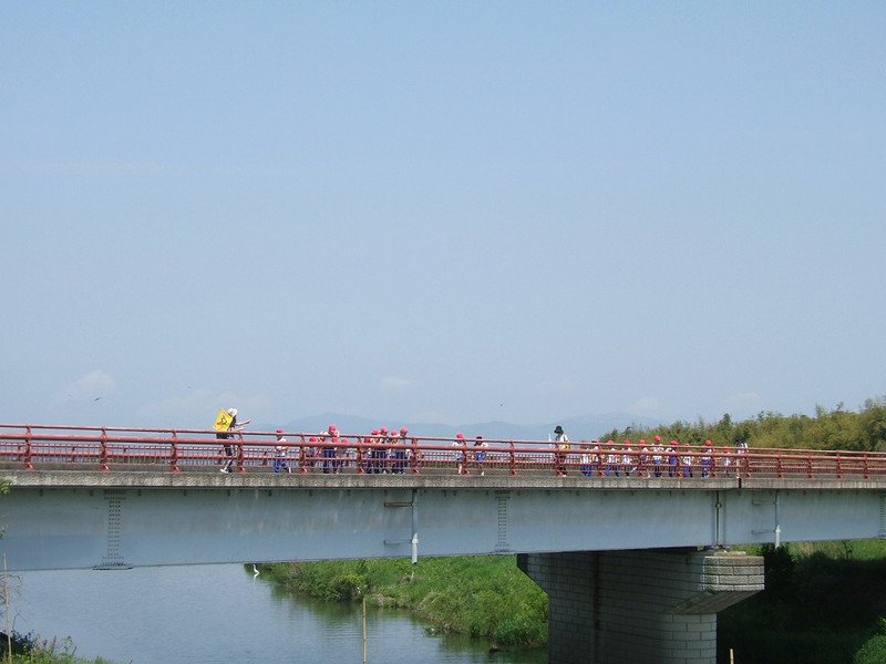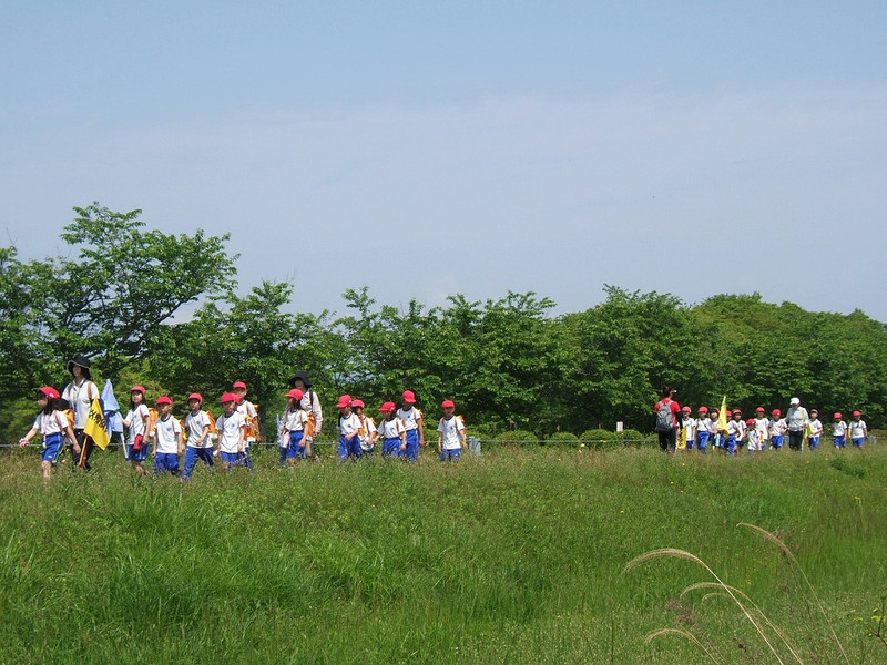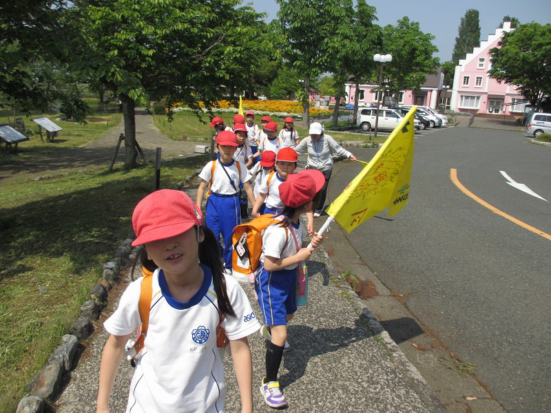 しんあさひ風車村までバスで行き、風車村からたてわり班 赤・青・黄の3つの色に分かれて、3年生をリーダーに歩いて、こどもの国へと向かいました。