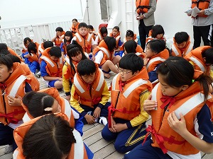 船での学習の一つ目は安全。まず避難訓練から始めました。初めて救命胴衣に悪戦苦闘しています。