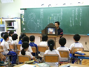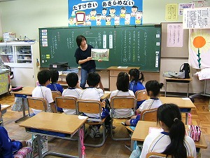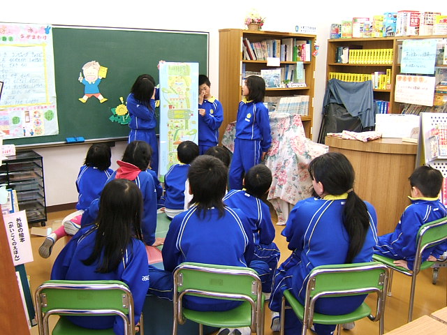 いま、2年生では生活科で、地域の人々とかかわりを持ち、さまざまな場所やものを調べたり、利用したりすることを通して、それらが自分たちの生活を支えていることや楽しくしていることに気づき、地域に愛着や親しみを持って、人とかかわっていくことができることをねらいに、「まちたんけんに出かけよう」という学習を進めています。