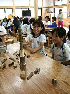2日目は、朝の活動で、木ぎれを使って、タワー作りを楽しみました。