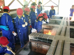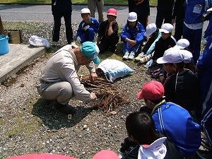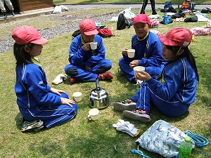 その後、「火付け体験」と「お茶わかし体験」をしました。地域の方に火の付け方を教えてもらいました。火が付くと、飯ごうに湧き水を入れ、お湯を沸かし、火にあぶったお茶の葉を揉んで入れました。