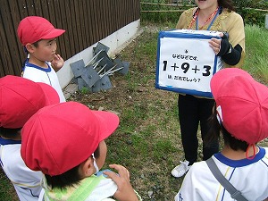 1日目開校式から始まり、「もりもり探検」に出かけました。まず、葉っぱでジャンケンをしました。