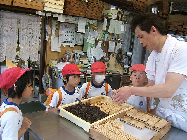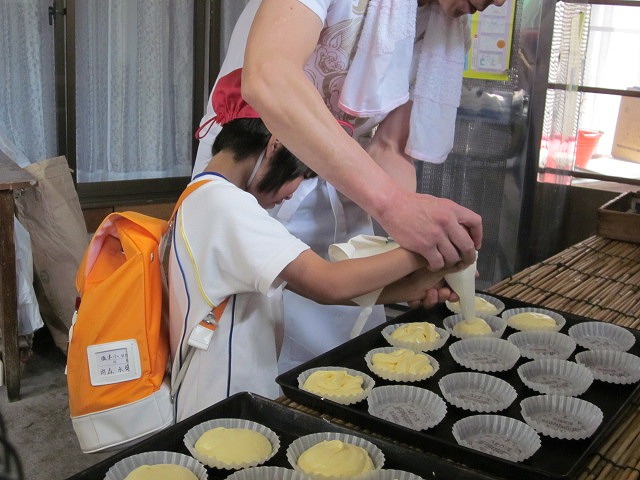 菓子処のいしだやさんでは、店長さんのお菓子づくりの技や機械などを見せていただくだけでなく、自分たちも実際に体験させていただきました。マドレーヌの生地しぼりでは円を描くように入れることの難しさに、またもなかのあん詰めではちょうどいい量のあんをきれいにつめることの難しさに気づき、店長さんの技のすごさを身をもって体験することができました。いまの店長さんは3代目で、店長さんのおばあさんが始められたそうです。お菓子だけでなく、赤飯やおもちなども売っておられました。また、よく売れる時期をお聞きしたところ、ひなまつりや入学式などたくさんイベントのある、春がよく売れることを教えていただきました。