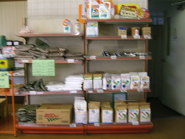 JA北びわこしおつ店では、野菜のたね、農薬や除草剤、カマに長靴、また米酢やつけもの用のたるなど、畑や田んぼなどの仕事に関係のあるものがたくさん売られていました。広い倉庫には、たくさんの肥料や土が積まれていました。また、お金を扱われる銀行みたいな仕事もされているそうです。4人で働いておられることもわかりました。
