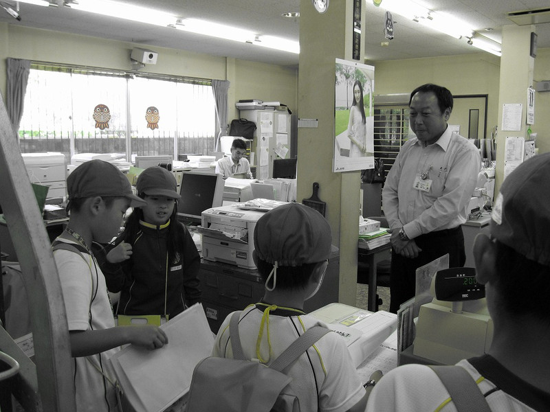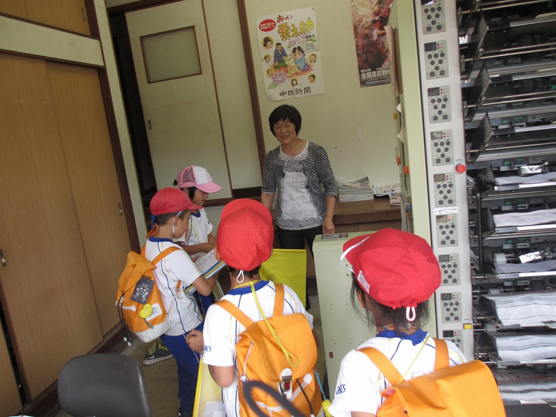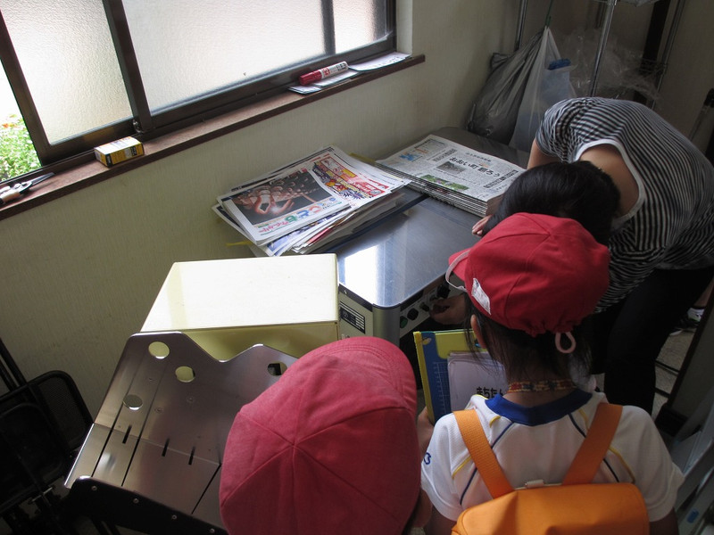 平塚新聞店は、昭和29年に始められたそうです。当時、新聞配達の仕事をされていた平塚書店の店長さんがお亡くなりになられ、大変そうな様子を見た今の店長さんのおじいさんとおばあさんが「うちでしましょうか」と引き受けられたのが、仕事を始められたきっかけだそうです。毎日、塩津と永原のおうちに届く1200部の新聞を、朝2時に起き、新聞に分けたりチラシをはさんだりして、朝4時ごろ配達のお手伝いをしてくださるおうちへ届けられるそうです。「大変なことは、何ですか?」と質問したところ、「月に1回しかお休みがなく、お泊りの旅行になかなか行けなかったことかな」とおっしゃっておられました。チラシをとっていく機械や、チラシをきれいにそろえる機械など、機械のかしこさにびっくりしましたね。