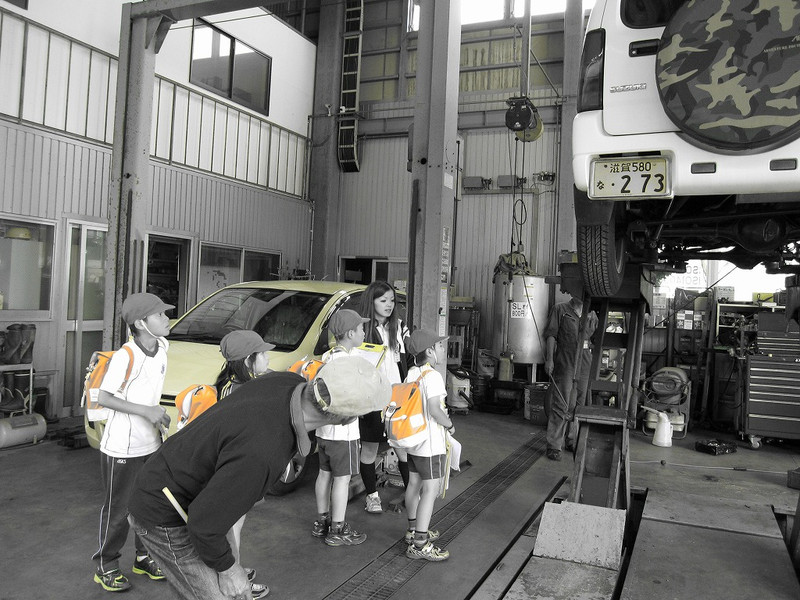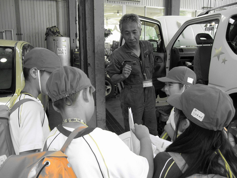 湖北モータースでは、車の修理や点検のお仕事をされているそうです。修理場には大きな音が響いていていました。スイッチを押されると車が上がっていき、下に入って修理できるそうです。また、大きな穴みたいなところもあり、その穴に下りて修理されることもあるそうです。事務所には、大きなレーシングカーや車の部品が展示されていました。特別に乗せていただいたトラックの運転席から見た景色は、とっても高くて、ちょっとこわいくらいでした。