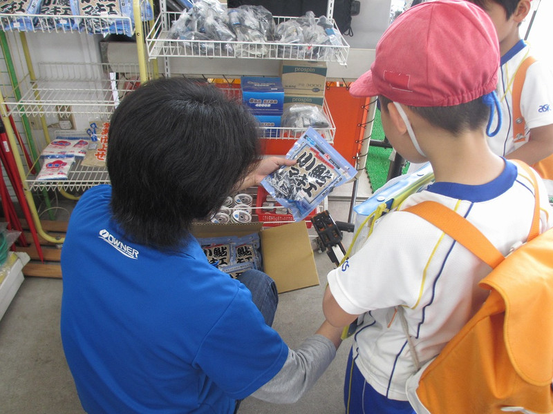 25年前に始められた平塚フィッシングセンターは、朝早くから釣りをされる方のために、朝早くからお店を開けられているそうです。お店には、つりざおにえさ、イカを釣るための釣針や、魚を呼び寄せるために使うルアーなど、釣りに関するいろいろなものが売られていました。ルアーは、魚だけでなく、ザリガニやカエルなどもあってびっくり!!また、体験させていただいた値段貼りでは、店員さんは簡単そうに次々貼っていかれたのに、実際にやってみるとまっすぐ貼れず、むずかしかったですね。