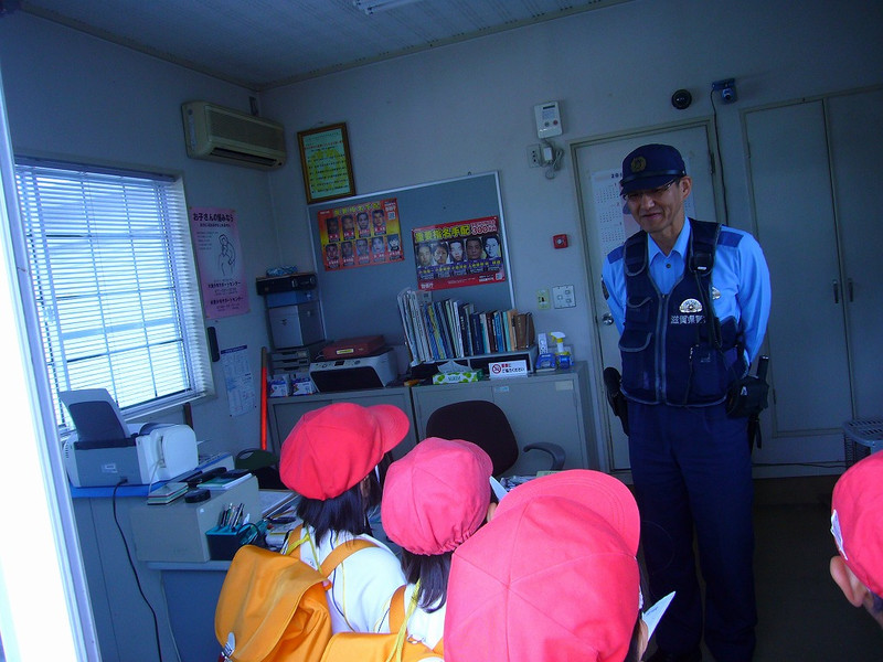 みんなのくらしや安全を守ってくださっているおまわりさん。塩津駐在所では、2人で働いておられるそうです。たくさんのポケットがついた制服を着たおまわりさんは、手錠に警棒、拳銃にトランシーバーなどいろいろなものを持っておられました。特別にパトカーの中も見せていただいたところ、意外や意外。中は、おうちの車とほどんど同じでした。違うのは、無線(マイク)がついているところだけ。1日中パトカーに乗っているときもあれば、1回しか乗らない時もあるそうです。