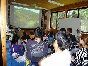 外はあいにくの雨。最初に学舎で山門湿原の自然について説明をいただきました。