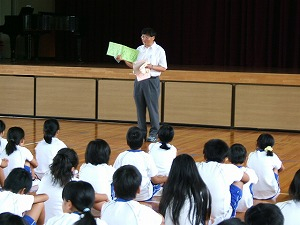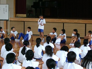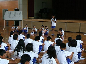夏休みの思い出を発表しました。子ども会の行事で花火をして楽しかったこと、竹生島へ行ったこと、伊吹山に登ったこと、友達と川で泳いだこと、沖縄へ行ったこと、県の陸上記録会に出場したことなど、がんばったことや楽しかったことを全校の前で話しました。