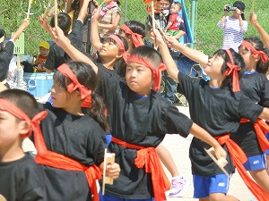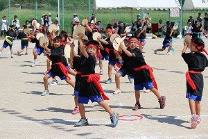 午前の最後の種目は、下学年(1・2・3年)の「エイサー 琉球の風~2012~」です。昨年から、下学年と上学年に分かれての表現活動となりました。