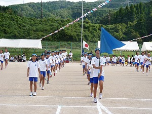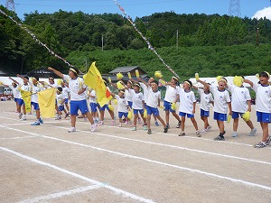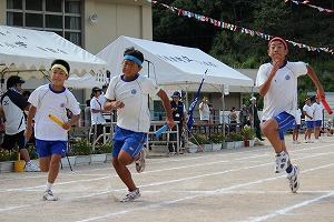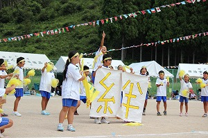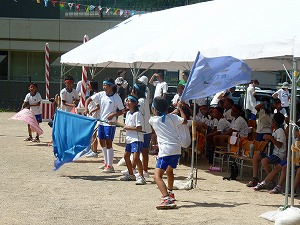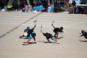 午後のはじめは、応援合戦です。2学期始まると同時に、6年生を中心として3色に分かれて応援のシナリオを考えます。各色ごとに、時間をとったり、中休みや昼休みを利用して練習を重ねました。応援合戦を中心とした3色の取組には「塩っ子賞」が与えられます。それを目指して、みんな燃えるのです。