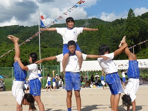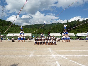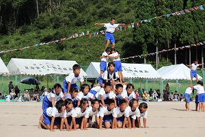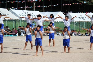 昨年度から始まった「組体操」。4~6年が1学期の終わりから少しずつ練習を積み重ねてきました。