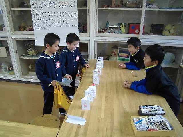 今回は塩っ子祭りのときとは違い、お店の仲間がいっしょです。気に入って4回も来店してくれたお友だちもいて、とってもうれしそうだと思えば、たくさんのお客さんにてんてこまいになっていたり・・・。どの店も、こども園のお友だちにも分かるように、やさしくていねいに説明している2年生の姿がありました。たった30分の開店でしたが、きっとこども園のみんなに喜んでもらえたことでしょう。