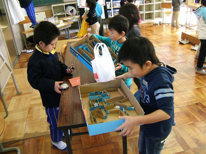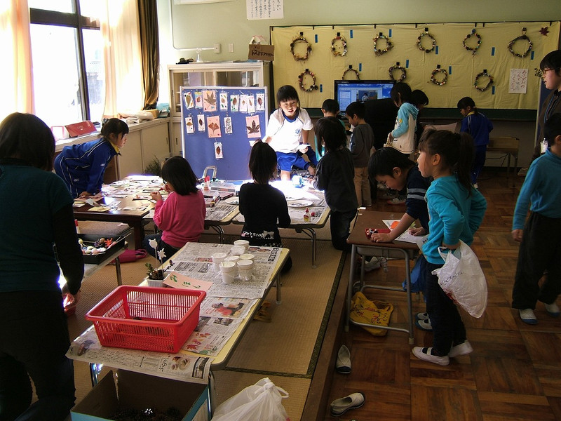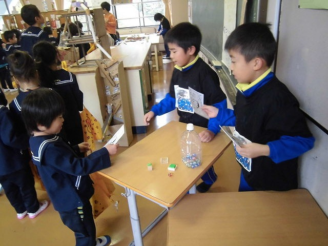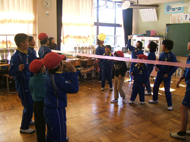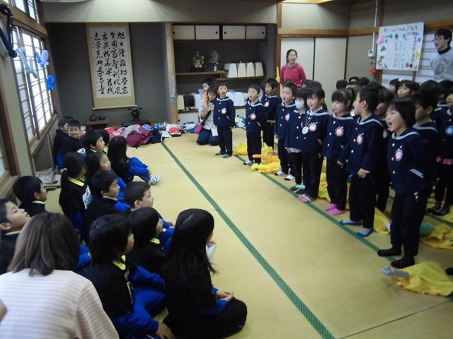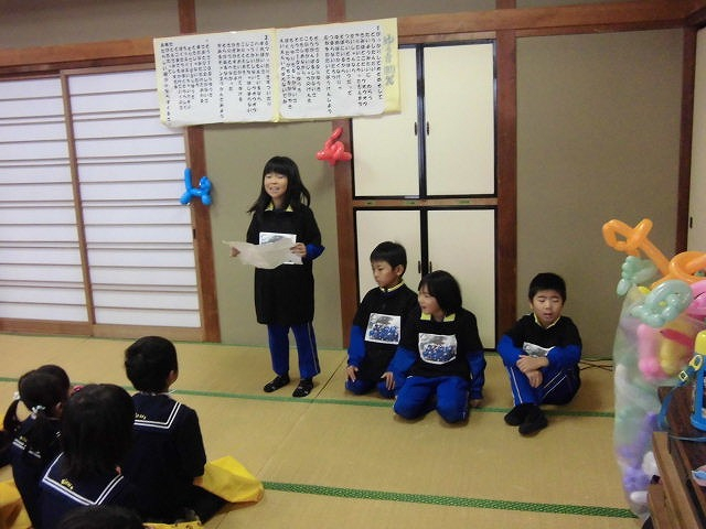 あっという間に時間はすぎ、ふたたび和室での“おわりの会”。がんばって小学校まで歩いて来てくれたお礼に、2年生から「勇気100%」の歌のプレゼントをしました。いっしょに歌ってくれているこども園のお友だちもいて、うれしかったですね。また、塩っ子祭りでの体験を活かして、バルーンアートを教え合って作り、プレゼントをしました。こども園のみんなから、ステキな「小さな世界」の歌のプレゼントをいただき、とっても楽しい時間を過ごすことができました。
