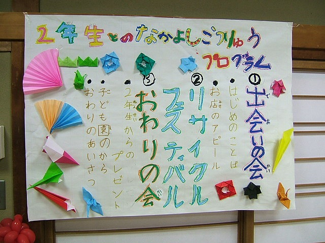 まず、和室での“出会いの会”。こども園のみんなのきらきらした目に注目され、ちょっぴり緊張した面持ちの2年生。しかし、この後する“リサイクルフェスティバル”のお店やさんの紹介では、こども園のみんなのかわいらしいうれしそうな反応に、笑みが広がりました。