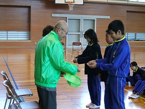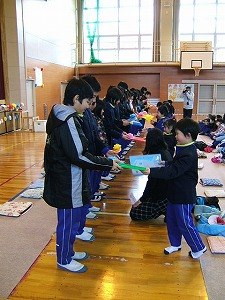 最初は、1年生によるプレゼント渡しです。ファイルの中には、6年生の似顔絵が入っています。