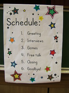 前半、「What do you like ~?」「Can you ~?」など、今ま学習してきたいろいろな質問の仕方を使って、インタビューや会話を楽しみました。
