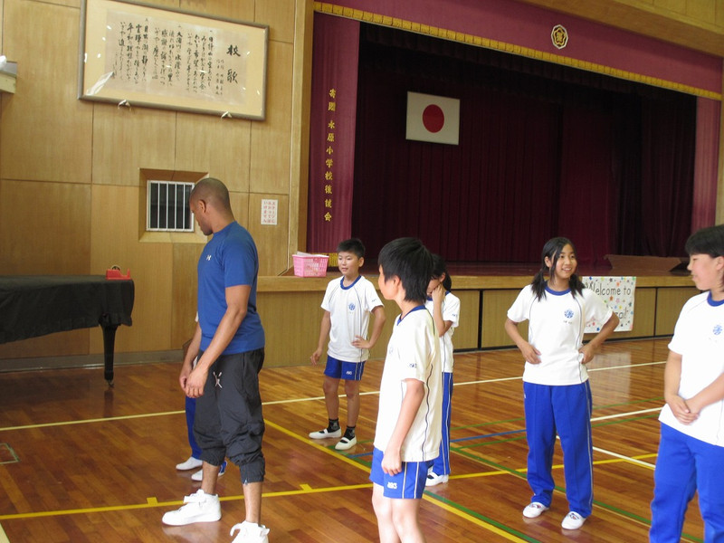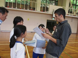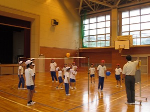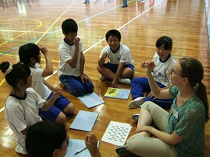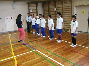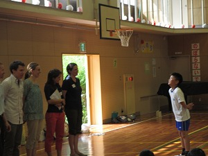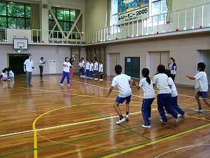 ダンスを踊ったり、ローマ字での自分の名前を手話で表したり、フットボールの投げ方を教えてもらって簡単なゲームをしたりなど、ALTの先生が説明してくださる英語を一生懸命聞き、理解し、どのグループも盛り上がっていました。