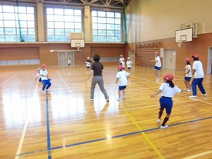 <赤2班>同じく体育館で、ドッヂビーをしました。予想外の動きに翻弄されながらも、上手にキャッチし、みんなで楽しみました。