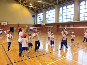<赤1班>体育館で、風船バレーです。2つの風船がとびかうので、みんな気が抜けません。全員が楽しんでいましたね。