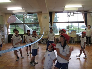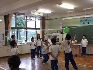 <黄6班>3年生教室で、風船バレーです。3チームに分かれ、楽しみました。どのチームが勝ったのでしょうか?4~6年の試合の時は、うまく3年生がリーダーとなって進めていましたね。