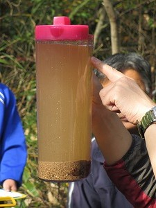 たて方向にみると、大きな砂は下に、粒が細かくなるほど上に堆積していくことがわかりました。横方向にみると、まず、れき(2mm以上)が、そのあと砂(0.06mm~2mm)が、最後に泥(0.06m以下)がたまるそうです。