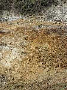 泥の層の上に砂れき層がみられ、さらにその上に泥の層、泥炭層が重なっていました。泥炭層からは木の化石も見つかり、子どもたちは興奮!