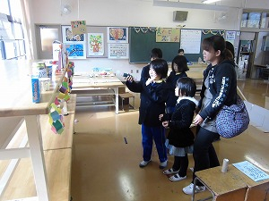 まず2校時は2年生のゲームコーナー「うごくおもちゃやさん」で楽しんでもらいました。