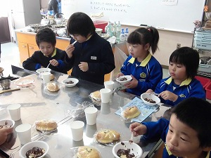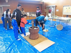 親父の会は、「もちつき体験」です。5年生が収穫した餅米を使っておこないます。つきあがった餅は、きな粉と醤油でいただきます。地域の方も一緒にいただきました。
