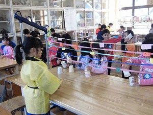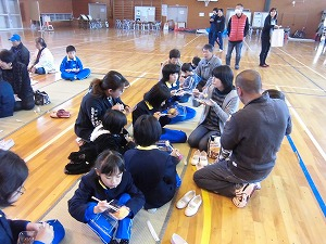 塩っ子祭り体験第1部は、親父の会、塩っ子ママの会、更正保護女性の会の皆さんが設営してくださったそれぞれのコーナーをたてわり班ごとに回ります。