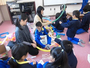 2年生は、身の回りにあるものを使って動くおもちゃを作り、みんなに楽しんでもらいました。