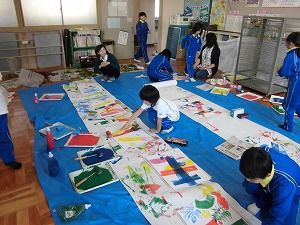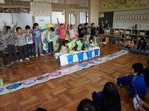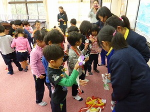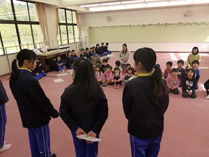 11月22日(金)2・3校時 本校2年生と5年生が認定こども園きららの年長さんのみなさんと交流する時間を持ちました。11月16日に行いました。「塩っ子祭り」の活動をもとにゲームや発表をして楽しみました。