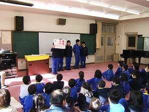 まず出し物は紙芝居です。不審者、空き巣注意を促す安全に関わる簡単な紙芝居を紹介しました。セリフを読む場面では、うまく感じがでるように工夫して読み、みんなで声を合わせる場面も取り入れて、みなさんから拍手をいただP1010158きました。
