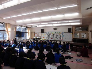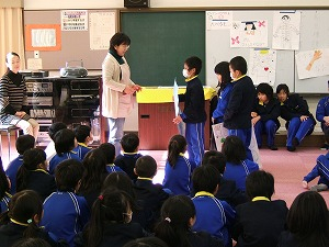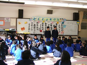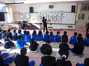 最後に校長先生がまとめをしました。冬に降る「雪」をもとに、いろいろな言葉(粉雪・綿雪・細雪・淡雪・風花・・・・)で雪を表現している日本語のよさを伝えました。本を読むことや、詩や俳句など声に出して朗読することですばらしい日本語を身につけて欲しいと話しました。