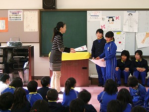 最後に、日頃給食でお世話になっている、給食センターの調理員さんや栄養士さん、配膳のお世話になっている杉本さん、牛乳屋さんなどに、感謝の言葉を手紙などに託して渡しました。