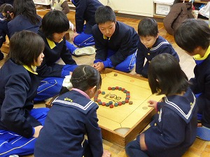5年生は、お互いの自己紹介の後、室内ゲームのカロムを楽しみました。きららの皆さんは初めてカロムをする子ばかりでしたが、5年生の子どもたちがマンツーマンで教えました。最初は緊張の面持ちだった園児の皆さんも次第に笑顔と歓声が出始めて、楽しく過ごすことができました。