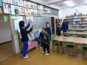 P1010116  次は学校探検です。学校内の特別教室を中心に1階から3階をめぐりました。いっぱいの教室に驚く子達が多かったです。