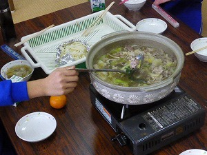 P1010129 いっぱいの量をいただきました。お鍋の他におにぎり、みかん、牛乳もついています。おにぎりを5つも食べた子もいました。