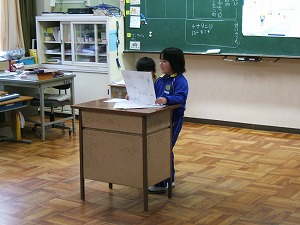 3番目は、1年生の発表です。「てんとうむし」「とおくに見える木」「そら」「おちば」の4つの詩を大きな声でしっかりと暗唱することができました。元気な声で気持ちよかったです。