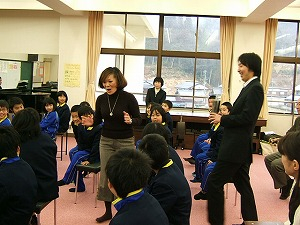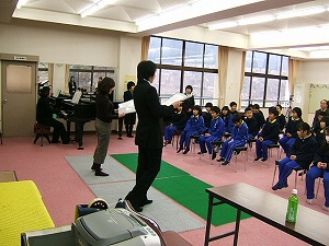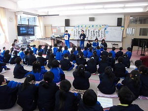 17日(月)にびわ湖ホールから3人の方が塩津小学校へ来て下さり、声楽アンサンブルを開いて下さいました。アンサンブルメンバー2人と、ピアニスト1人の方々です。初めに、子ども達が音楽の教科書で学習している文部省唱歌を交え、「茶摘み」や「もみじ」「とんび」等を歌って下さいました。斉唱でとても美しい声で歌って下さり、子ども達の中から「すごーい!!」という驚きの声が聞こえてきました。男の人の「バス」の声はとても低くずーんと重みのある声で、一方、女の人のソプラノの声は、透き通るような美しい声でした。今まであまり耳にすることのない歌声に本当に圧巻でした。子ども達は、たくさん聴かせていただいた中でも「アラジン」の歌がとても良かったようです。もう一度聴きたいほどです。