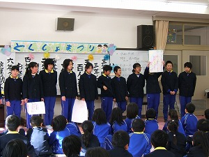 図書委員会は、自分が好きな人物を写真と共に発表し、その偉大さや好きなわけを発表しました。「マザーテレサ・キュリー夫人・ヘレンケラー・宮本武蔵・松井秀喜・イチロー」の紹介です。教頭先生も飛び入りで「イチロー」のすごさについてお話ししました。