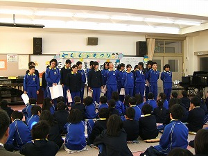 Dscf5294 その後、先日募集した給食に関する標語の表彰をしました。「食べ物は、感謝をこめて 食べましょう」や「すききらい ゼロをめざして がんばるぞ」などの標語が表彰されました。