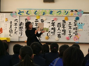 5年生は、古典の代表の「百人一首」を発表しました。歌を詠み、様子の説明を入れることで情景が目に浮かぶ工夫をしました。