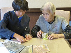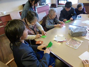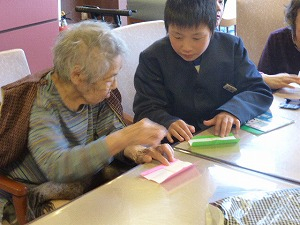次は製作活動です。折り紙を一緒にしました。「ひこにゃん」「バリーさん」「ドーモくん」いろいろな可愛いキャラクターづくりです。愛らしいのですが、とても難しい折り紙です。ホームのお年寄りさんも子どもたちの難しい注文を優しく聞いて下さって、しっかり子どもたちとの折り紙をつきあって下さいました。そして可愛い作品がいっぱい完成しました。